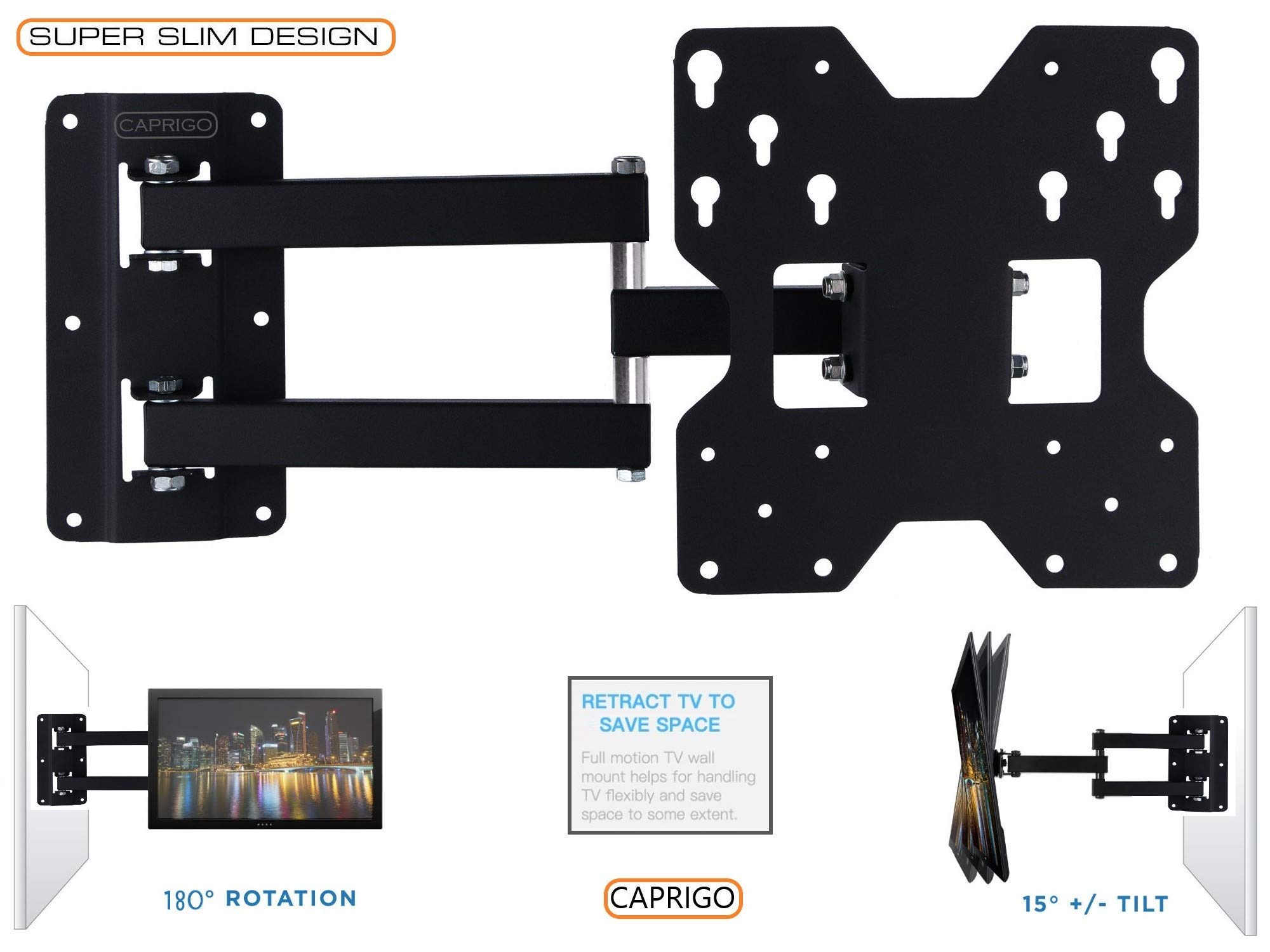 Entire Viewing Flexibity : This Television wall mount provides Entire viewing flexibility permitting you to rotate your TV 180 Levels Proper to Left and tilt the TV 30 Levels As much as Down . Complete Movement rotation makes it Simple to seek out the most efficient viewing perspective and scale back glare from lighting fixtures or home windows.