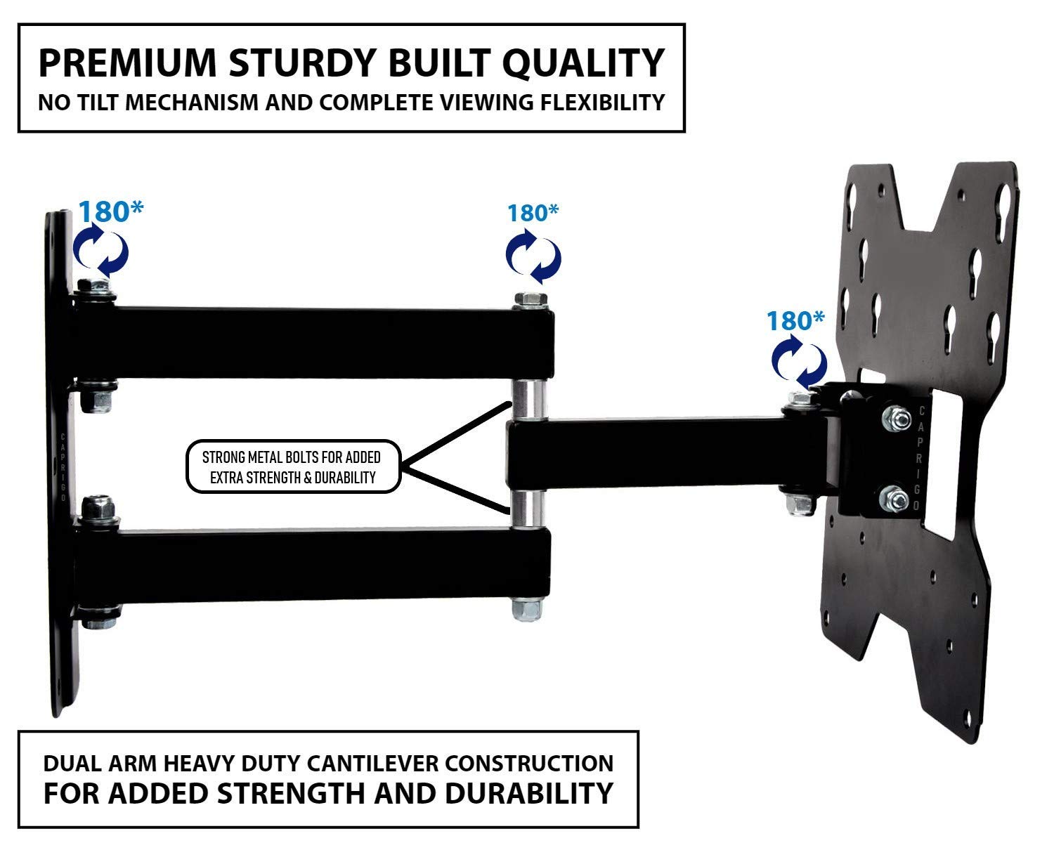 Top class Constructed High quality : Heavy Accountability neatly Constructed Television wall mount . Sturdy , robust and lengthy sturdy Constructed High quality . Forged Twin arm development for added protection . Low profile and sublime Layout . The heavy Accountability mount quickly Helps the load of the TV, and it guarantees protection and peace of thoughts while correctly put in. The security loading weight is 25 kgs.