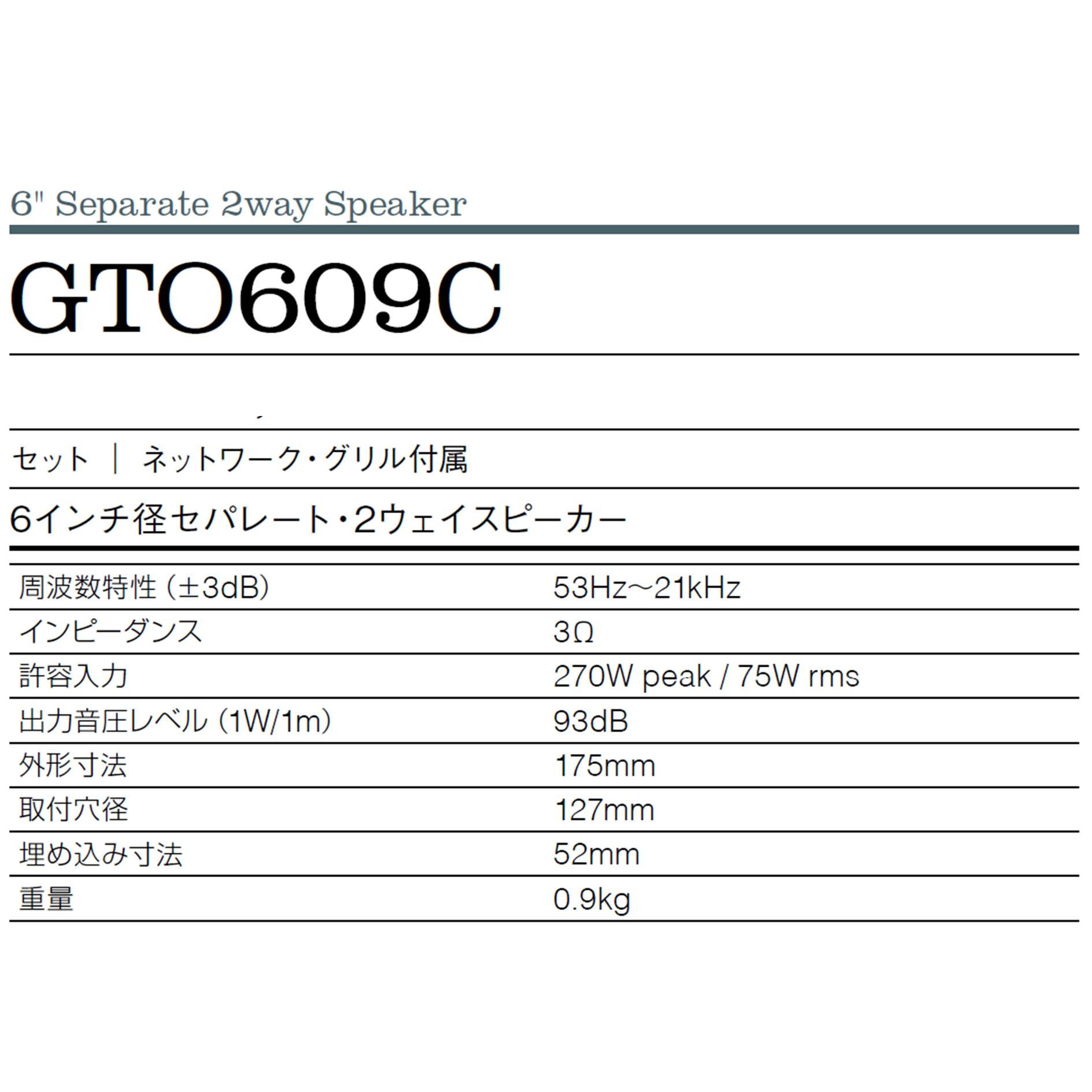 >Low-distortionlow-Q >Plus Onewoofer cones >Side-pushed MyTiTM with I-MountTM and Starfish mounting device >Outboard passive crossover with tweeter degree adjustment >Polycaps and tweeter protectiontweeter-degree adjustment >Goldplated terminals >Designed to suit smartly into virtually all manufacturing unit speaker places Specs GTO-609C Sort 6-half of”(16omm)2-Method LoudSpeaker Continous Energy coping with 90W Height Energy coping with 360w Freequency Reaction 50Hz-21kHz Sensitivity 92dB Commonplace impedance 2 Ohms Cone Proprietary Plus Onewoofer cones Terminals Gold-Plated