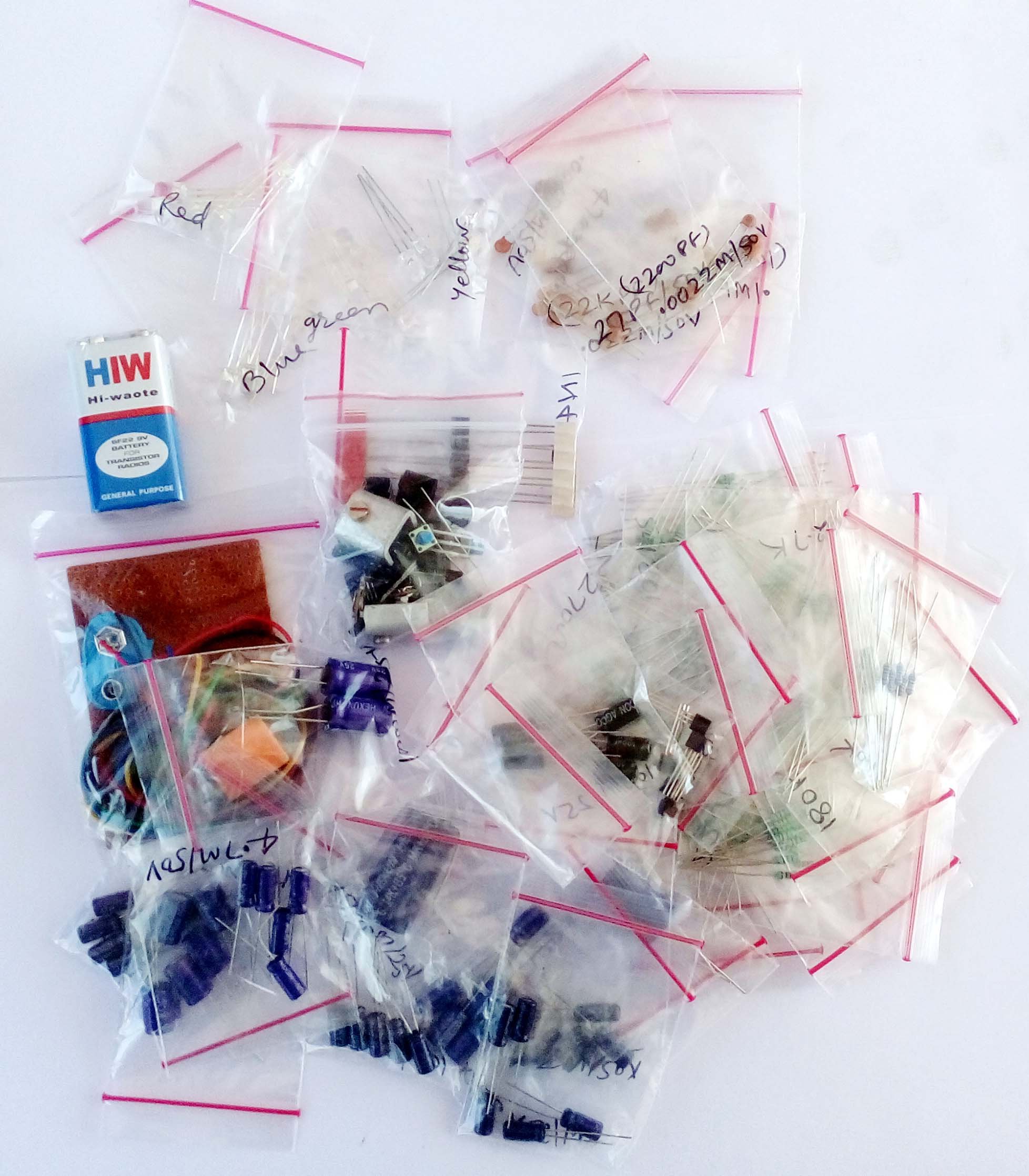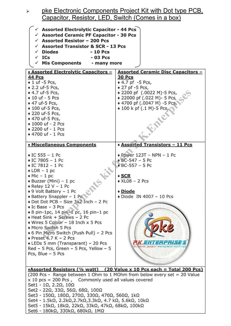 ♦ Diverse Electrolytic Capacitors – 44 Desktops ♦ 1 uf -five Desktops, ♦ 2.2 uf-five Desktops, ♦ 4.7 uf-five Desktops,♦ 10 uf – 5 Desktops ♦ 47 uf-five Desktops, ♦ 100 uf-five Desktops, ♦ 220 uf-five Desktops, ♦ 470 uf-five Desktops, ♦ 1000 uf – 2 Desktops ♦ 2200 uf – 1 Desktops ♦ 4700 uf – 1 Desktops Diverse Ceramic Disc Capacitors – 30 Desktops ♦ 4.7 pf -five Desktops, ♦ 27 pf -five Desktops, ♦ 2200 pf (.0022 M)-five Desktops,♦ 22000 pf (.022 M)- 5 Desktops ♦ 4700 pf (.0047 M) -five Desktops, ♦ 100 Okay pf (.1 M)-five Desktops, ♦ Miscellaneous Parts ♦ IC 555 – 1 Laptop ♦ IC 7805 – 1 Laptop ♦ IC 7812 – 1 Laptop ♦ LDR – 1 Laptop ♦ Mic – 1 Laptop ♦ Buzzer (Mini) – 1 Laptop ♦ Relay 12 V – 1 Laptop ♦ 9 Volt Battery – 1 Laptop ♦ Battery Snappler – 1 Laptop ♦ Dot Dot PCB – Dimension 3×2 Inch – 2 Laptop ♦ Ic Base – 3 Desktops ♦ 8 pin-1pc, 14 pin-1 Laptop, 16 pin-1 Laptop ♦ Warmth Sink + Screws – 2 Laptop ♦ Wires 5 Color – 18 Inch x 5 Desktops ♦ Micro Transfer 5 Desktops ♦ 6 Pin Micro Transfer (Push Pull) – 2 Desktops ♦ Preset 4.7 Okay – 2 Desktops ♦ LEDs 5 mm (Transparant) – 20 Desktops Purple – 5 Desktops, Inexperienced – 5 Desktops, Yellow – 5 Desktops, Blue – 5 Desktops ♦ Diverse Transistors – 11 Desktops ♦ Energy 123T – NPN – 1 Laptop ♦ BC-547 – 5 Laptop ♦ BC-557 – 5 Laptop ♦ SCR ♦ XL08 – 2 Desktops ♦ Diode ♦ Diode IN 4007 – 10 Desktops ♦Diverse Resistors (Œ watt) (20 Price x 10 Desktops each = General 200 Desktops) (2 hundred Desktops – Vary among 1 Ohm to 1 MOhm from beneath each set = 20 Price x 10 Desktops = 200 Desktops , Repeatedly used all values lined Set1 – 1Ω, 2.2Ω, 10Ω Set2 – 22Ω, 33Ω, 56Ω, 68Ω, 100Ω Set3 – 150Ω, 180Ω, 270Ω, 330Ω, 470Ω, 560Ω, 1kΩ Set4 – 1.5kΩ, 2.2kΩ,2.7kΩ,3.3kΩ, 4.7 kΩ, 5.6kΩ, 10kΩ Set5 – 15kΩ, 18kΩ, 22kΩ, 33kΩ, 47kΩ, 68kΩ, 100kΩ Set6 – 180kΩ, 330kΩ, 680kΩ, 1MΩ