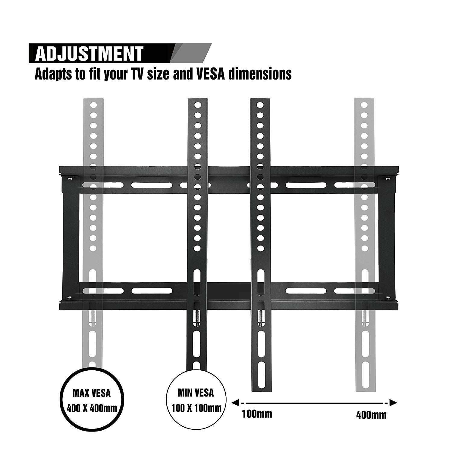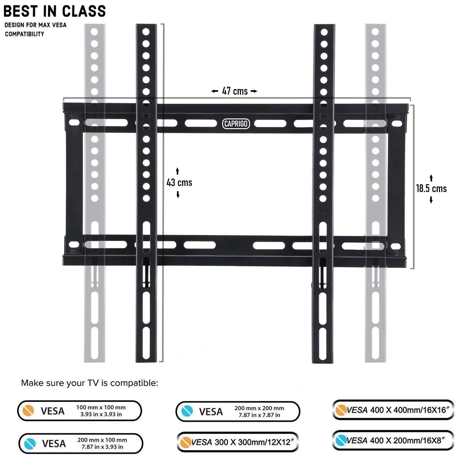 VESA COMPIANCE : 100 x 100 mm , 150 x 150 mm , 100 x 150 mm , 150 x 200 mm , 200 x 200 mm , 200 x 150 mm , 400 x 400 mm. Supported TV Sizes : 26 inches , 28 inches , 29 inches , 32 inches , 36 inches , 39 inches , 40 inches , 42 inches , 43 inches , 45 inches , 46 inches , 49 inches , 50 inches , 52 inches , 55 inches