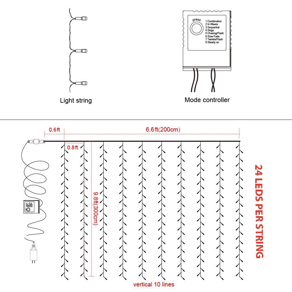 Specs: 1. Subject matter: PP & TPR & CR-V metal 2. Horizontal Period: 9.8ft/set 3. Vertical top: 9.8ft/set 4. LED Amount: 304 PCS/set 5. Colour: Heat White 6. Amounts of LEDs of each and every strand: 19PCS 7. Amounts of strands of each and every Curtain: 16PCS/set 8. The twine Period among plug and controller: 10ft 9. Voltage: 29V 8 Mode Mild Settings: 1. Mixture 2. In Waves 3. Sequential 4. Slo-glo 5.Chasing,Flash 6. Gradual Fade 7. Twinkle,Flash You’ll select the mode you prefer.