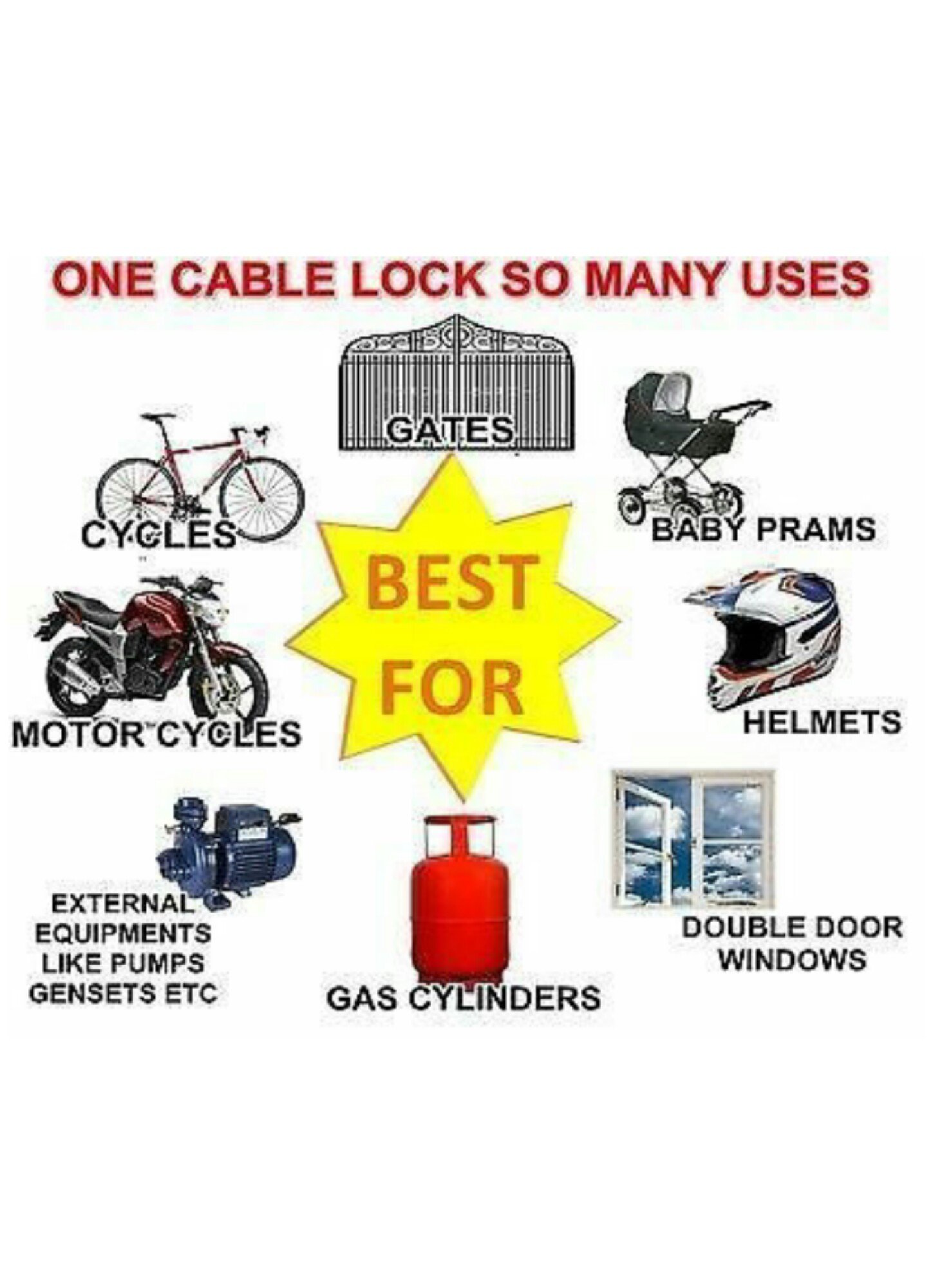 This Is Truly Helpful For : Locking Your Helmet With Your Motorcycle,Locking Your Cycle Or Motor Cycle Tyre.Your Gasoline Cylinder If It Is Out of doors.Your Motor,Water Meter ,Gen-Set,Any Exterior Out of doors Dear Equipments.Gates,Grills & Double Window Doorways.Even Your Child Prams And the like.Many Different Utilization Additionally Can Be Performed.BUY HIGH QUALITY PRODUCT
