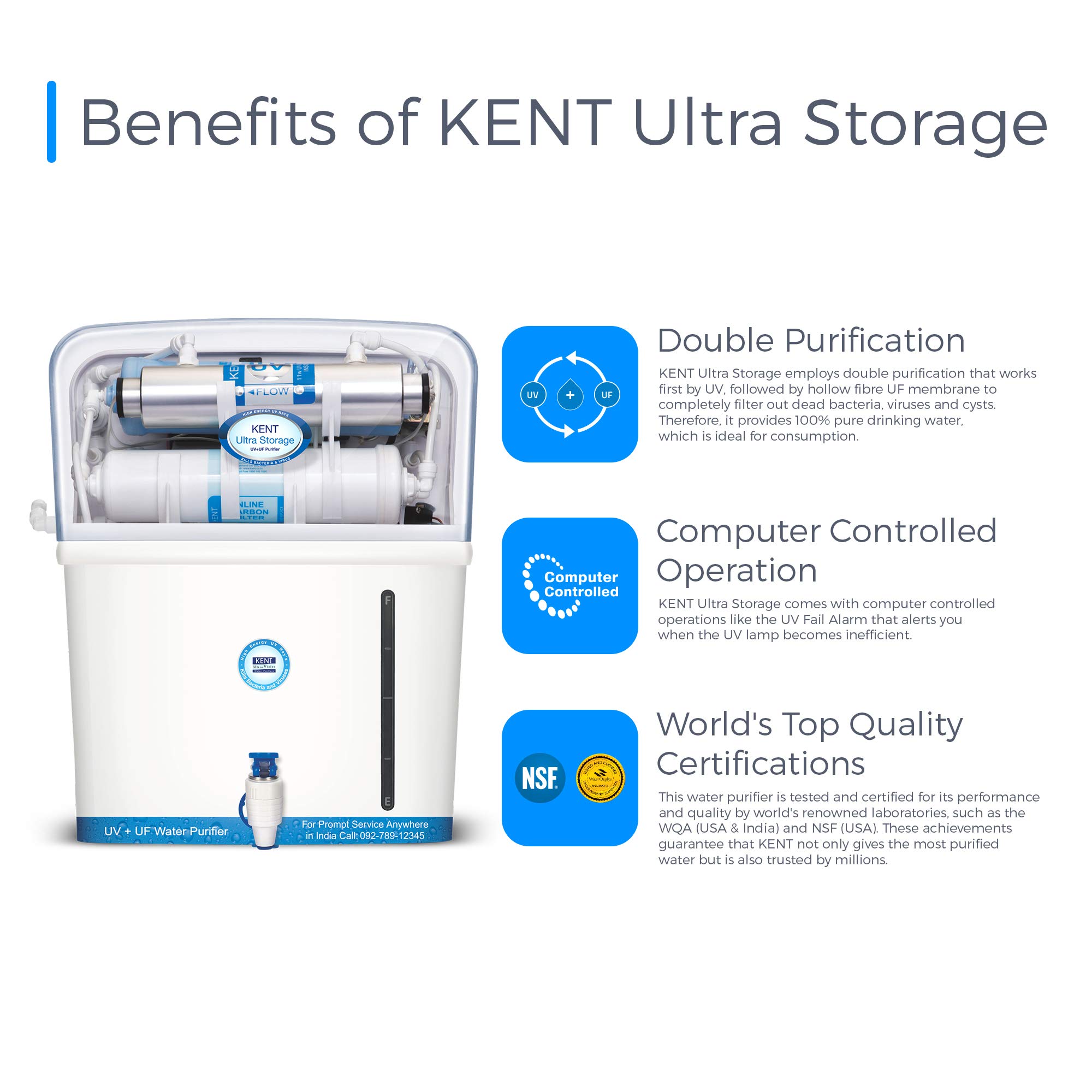 Kent Extremely Garage UV water Air purifier with water degree indicator in Garage tank KENT Extremely Garage is cost-efficient to possess and run UV water Air purifier with a Garage tank. Appropriate for wall mounting. Double purification via UV, UFdouble purification via uf after UV eliminates lifeless micro organism, viruses and cysts from the effective pores of hole fiber UF membrane, thereby offering 100 % natural, protected and attractive consuming water, which is perfect for Intake. Appropriate for low TDS water because KENT Extremely Garage is in accordance with UV and UF Generation that doesn’t put off dissolved impurities, It’s Appropriate to be used the place inlet water has low TDS(overall dissolved solids). Purified water Garage Capability of 7 L laptop managed operation with clear out amendment and UV fail alarms laptop managed operation has distinctive options – clear out amendment alarm and UV fail alarm. Time-based totally clear out amendment alarm notifies the Consumer to switch filters. UV fail alarm indicators the Consumer while the UV lamp turns into inefficient. In each the instances, Energy provide to the Air purifier is bring to a halt, thereby making sure that impure water isn’t brought to the Consumer. Top Energy 11W UV lamp for entire deactivation of damaging micro-organisms KENT totally automated operation with automobile-get started and automobile-off integrated smps that helps wide selection of Enter voltage (one hundred-300V ac) for coping with voltage fluctuations KENT Extremely Garage accommodates a integrated rugged smps (switching mode Energy provide) as an alternative of a normal Energy adapter. It’s supplied to take care of a variety of Enter ac voltage (one hundred – 300 volts) which allows the Air purifier to stick resilient against common Energy fluctuations, a commonplace downside in creating international locations like India. Spin-welded UF membrane housing that forestalls tampering first of its sort within the trade, push-have compatibility elements for leak-evidence efficiency Capability: 60 l/hr. Or 1 l/min clear out cartridges: sediment, activated carbon, UF membrane (zero.01 to 0.1 microns).