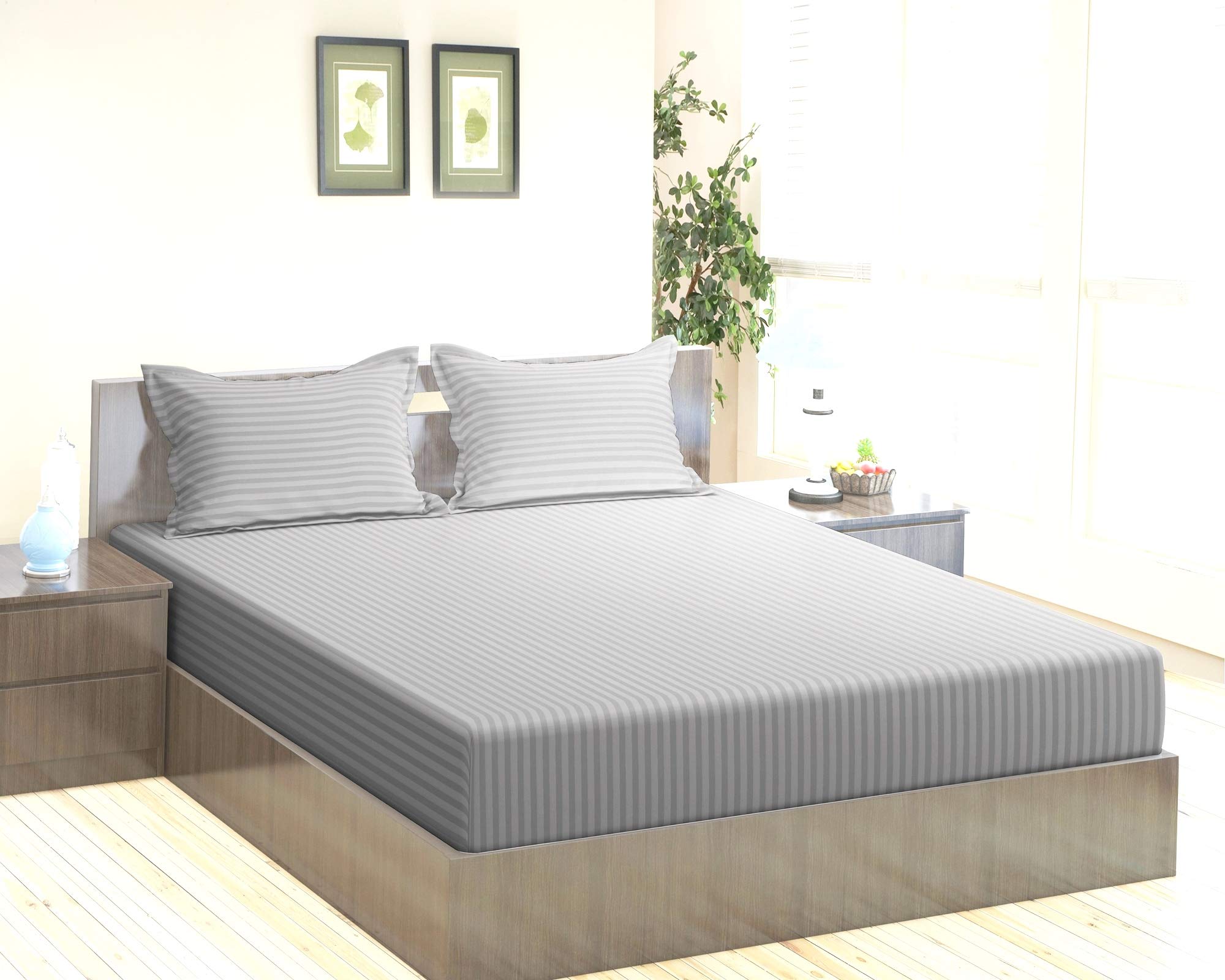 Superbly sublime, this mattress set is available in a delicate coloration of silver gray. The set features a double mattress sheet and pillow covers made from natural cotton and a satin weave which provides it a shiny sheen. Comfortable and opulent, it comes with a striped development and a prime thread depend to stay you handy.
